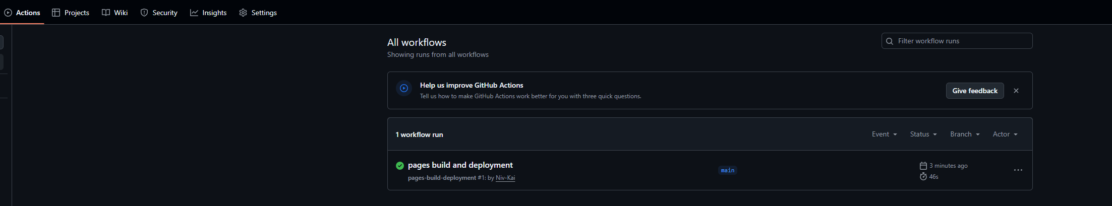 Actions 탭으로 이동하면 GitHub Pages가 자동으로 빌드된 로그를 확인할 수 있습니다.
