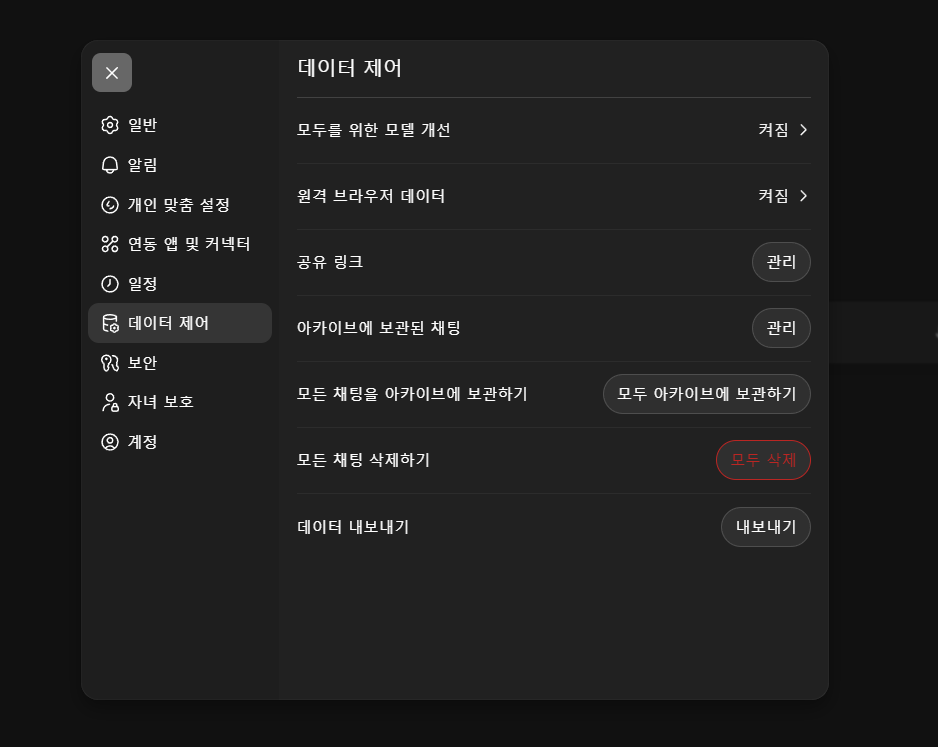 GPT -> 설정 -> 데이터 제어 -> 모두 삭제