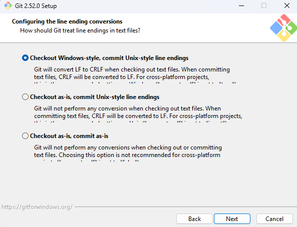 보통 Checkout Windows-style, commit Unix-style line endings 옵션을 사용하는 것을 권장합니다.