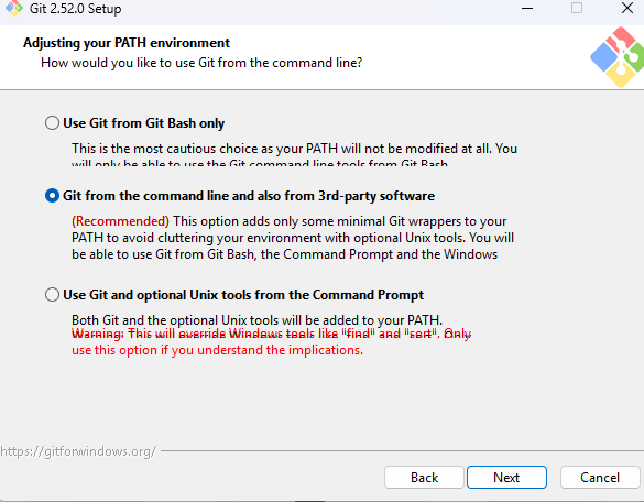 일반적으로 Git from the command line and also from 3rd-party software 옵션을 선택하는 것을 추천합니다.