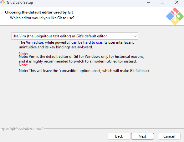 Git에서 커밋 메시지 등을 작성할 때 사용할 기본 에디터를 선택하는 단계입니다.