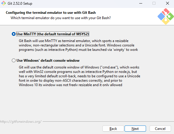 기본값인 Use MinTTY 옵션을 그대로 사용해도 무방합니다.