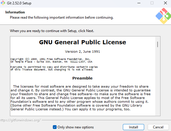 Git이 오픈소스(GPL) 라이선스를 기반으로 한다는 안내입니다.