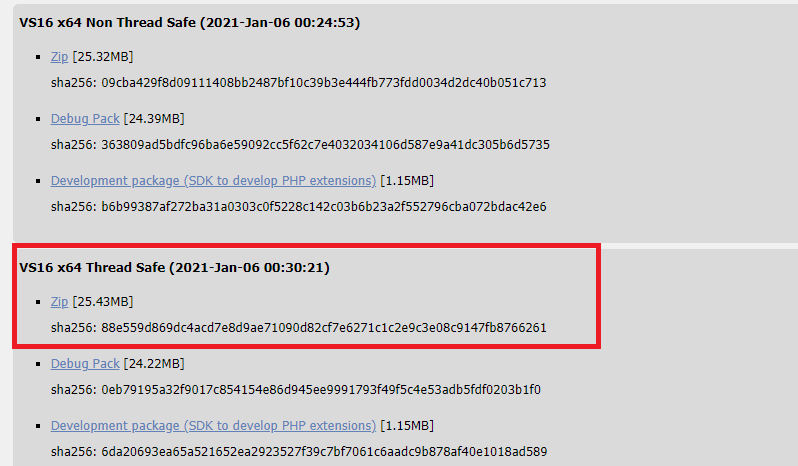 VS16 x64 Non Thread Safe (NTS) 버전과 VS16 x64 Non Thread (TS) 버전으로 크게 나누어져 있다.