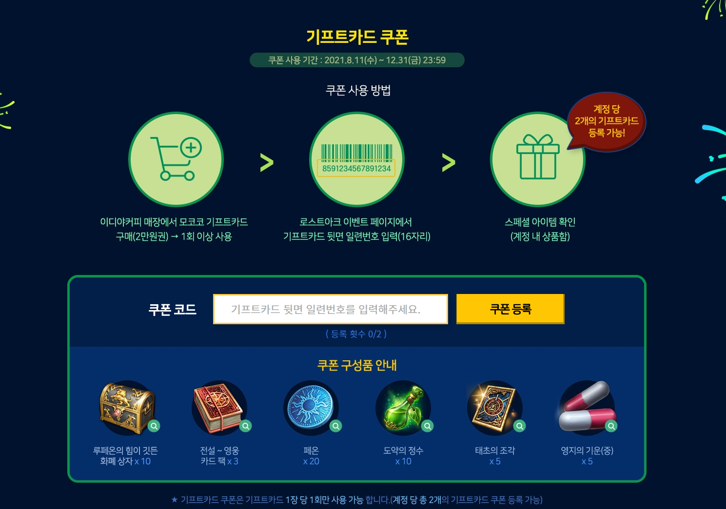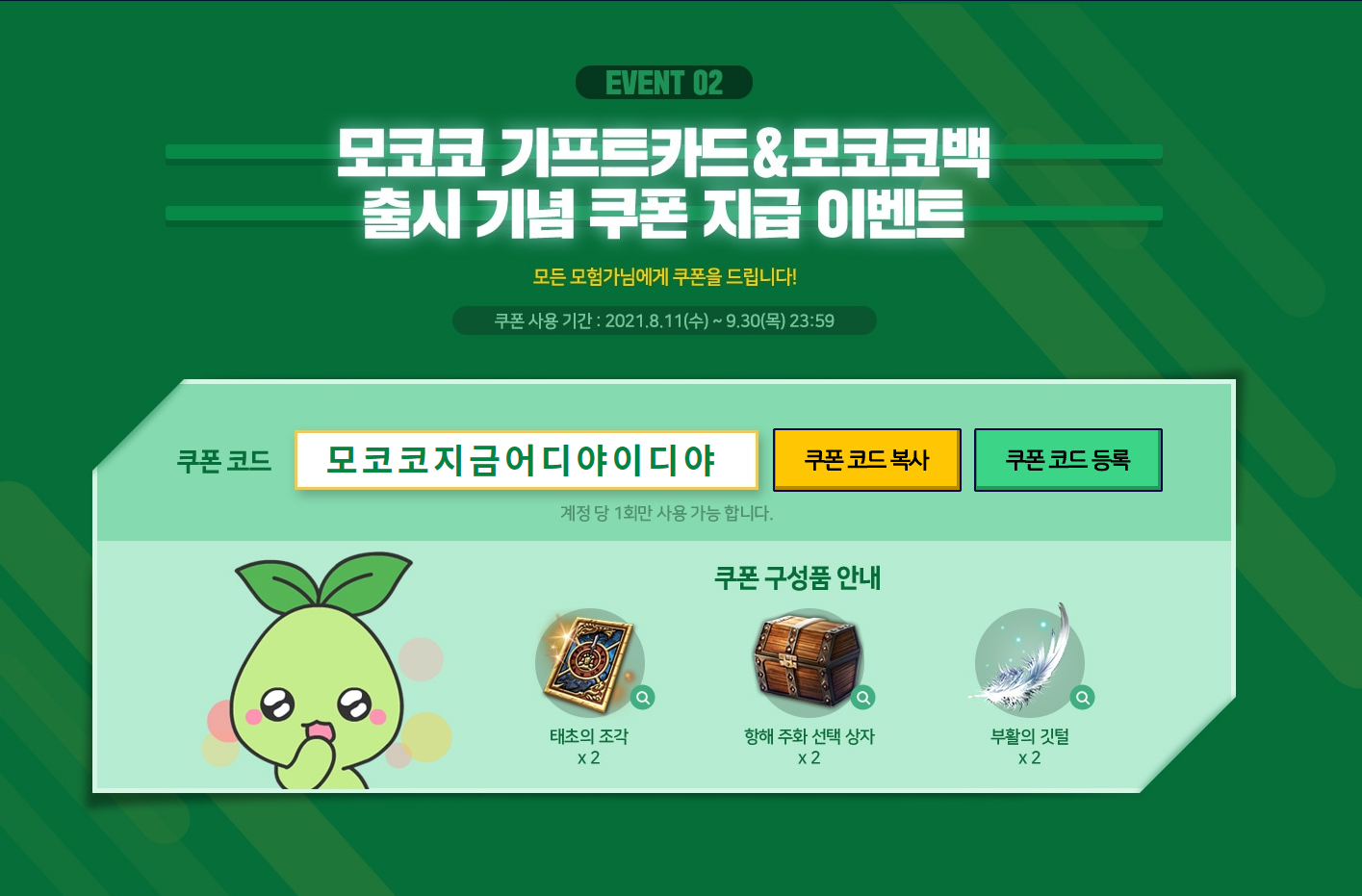 모코코 기프트 카드당 1회의 쿠폰이 제공되며 한 계정에 총 2개의 쿠폰을 사용할 수 있습니다.