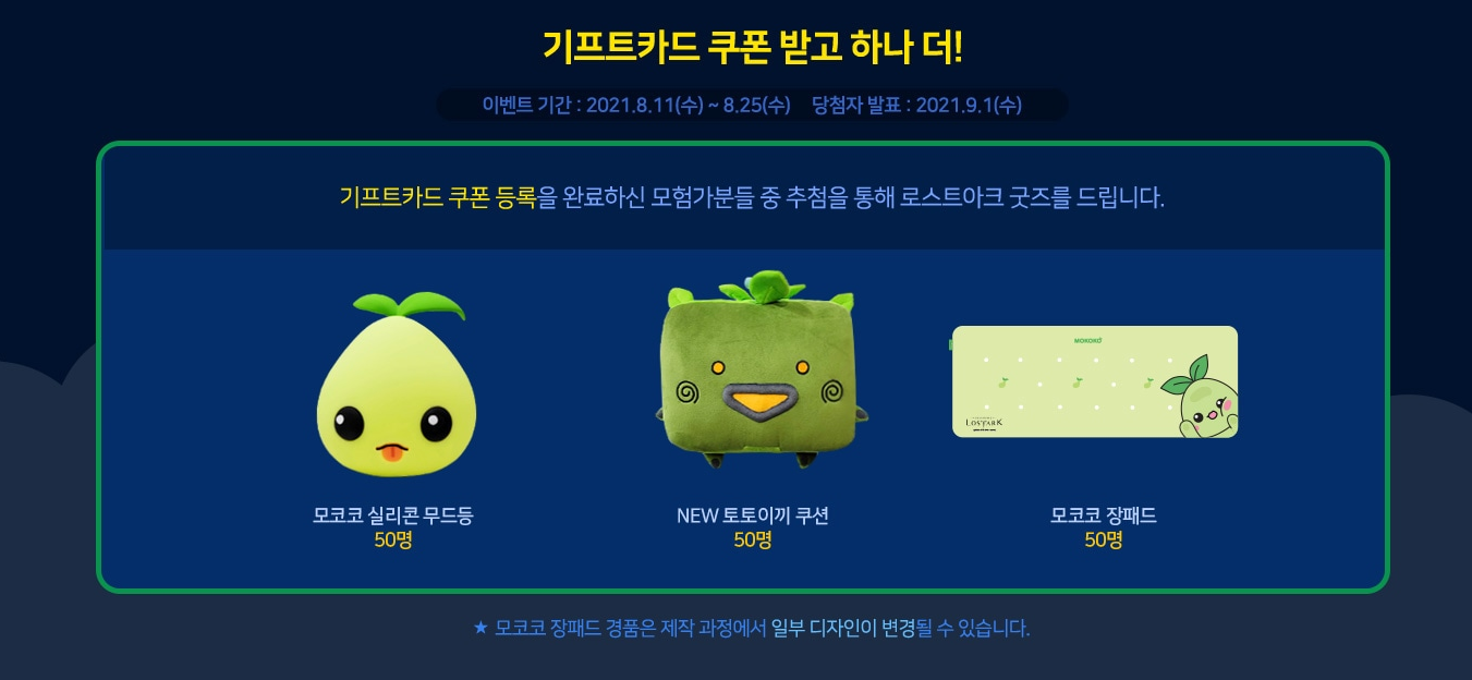 모코코 기프트 카드 바코드 일련번호를 입력하신 분들 중 추첨을 통해 로스트아크 굿즈를 드립니다.