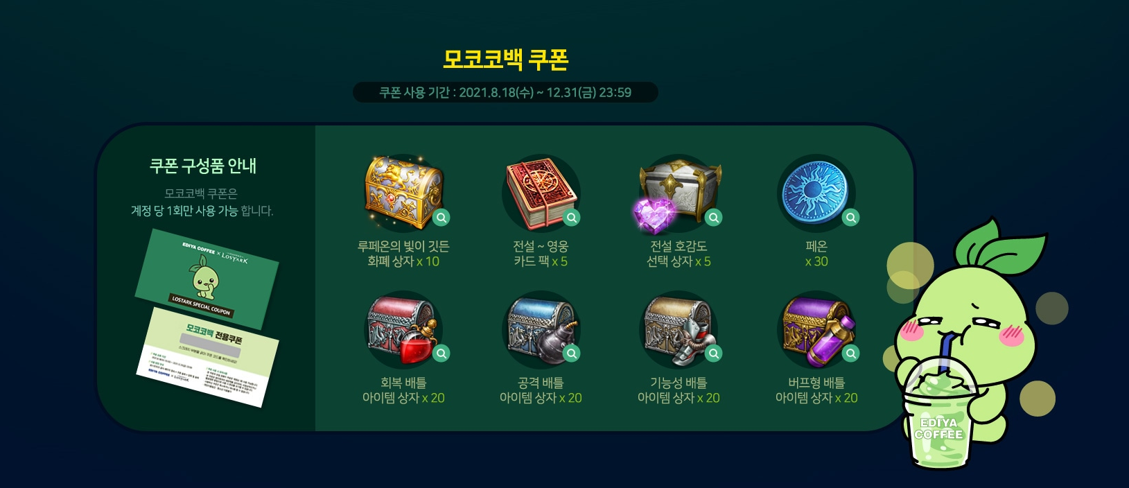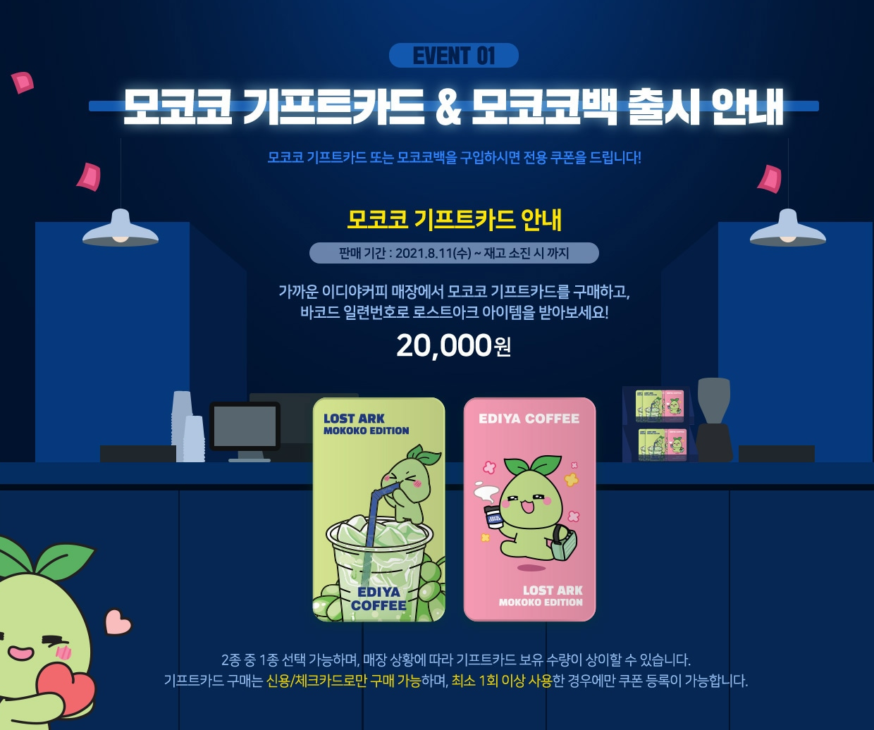 이디야 매장에서 모코코 기프트 카드 구매 후 바코드 일련번호를 통해 로스트아크 아이템 교환 가능합니다.