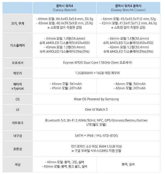 이번에 공개한 갤럭시 워치 4 시리즈 스펙입니다.