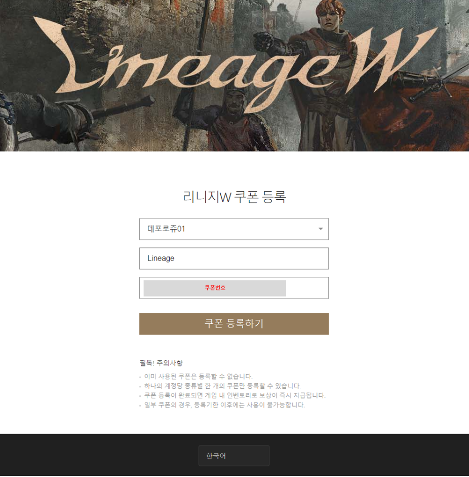 리니지W 쿠폰번호는 이미 적혀있습니다.