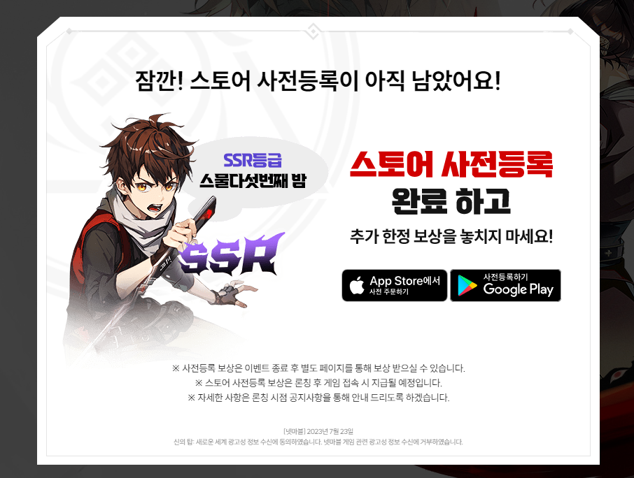 스토어 사전등록 추가 보상 SSR등급 스물다섯번쨰를 받을 수 있습니다.