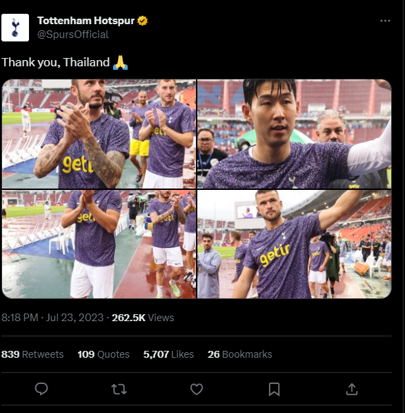 토트넘은 23일 오후 7시(한국시간) 태국 방콕의 라자망갈라 국립 경기장에서 프리시즌 아시아투어 레스터시티(잉글랜드)와 친선경기를 펼칠 예정이었지만 경기가 40분 지연된 후 물에 잠긴 경기장과 악천후로 인해 취소됬습니다.